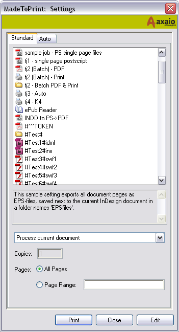 Über ein Bedienfenster listet MadeToPrint alle definierten MadeToPrint-Ausgabe-Jobs auf, die per Knopfdruck auf das jeweils geöffnete InDesign-Dokument anwendbar sind. Die Stapelverarbeitungsfunktion ermöglicht das Drucken/Exportieren mehrerer InDesign-Dokumente in einem Durchlauf.