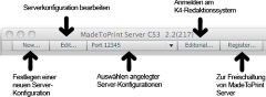 MadeToPrint Server UI kommuniziert mit dem MadeToPrint Plug-In durch Adobe ExtendScripts, welche es via SOAP an den InDesign Server sendet. Dafür müssen Sie entsprechende Verbindungen („Connections“, IP-Adresse und Portnummer) einrichten.